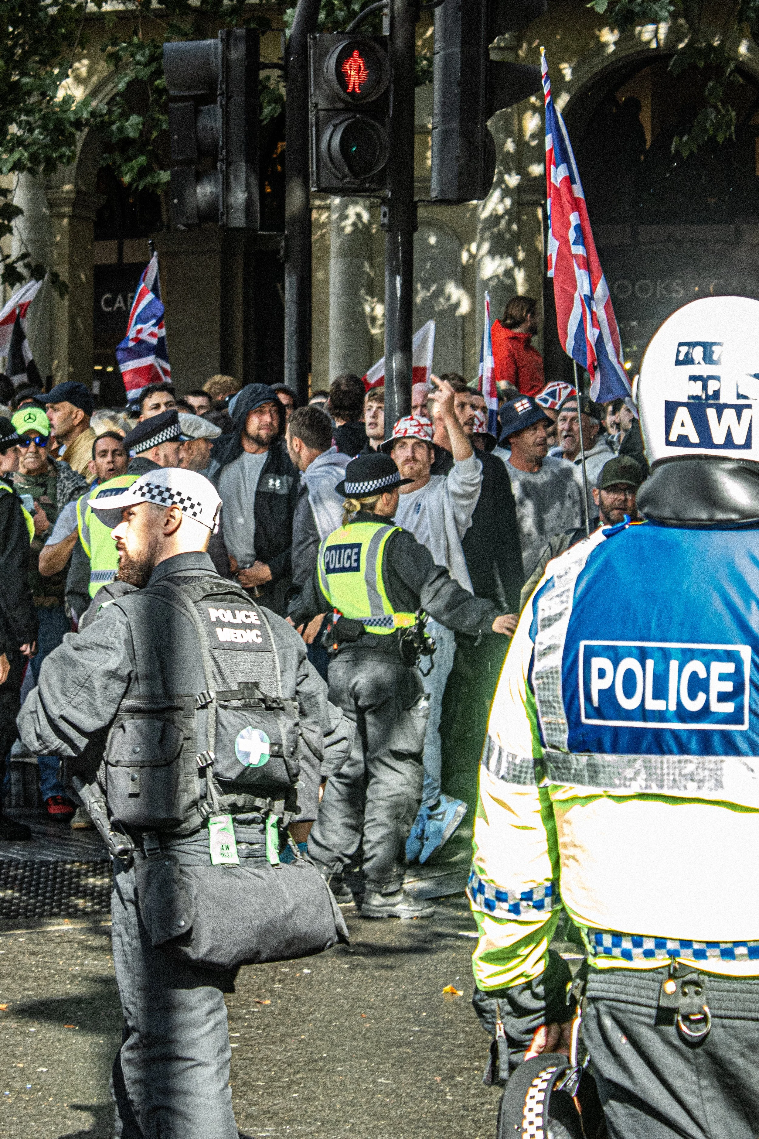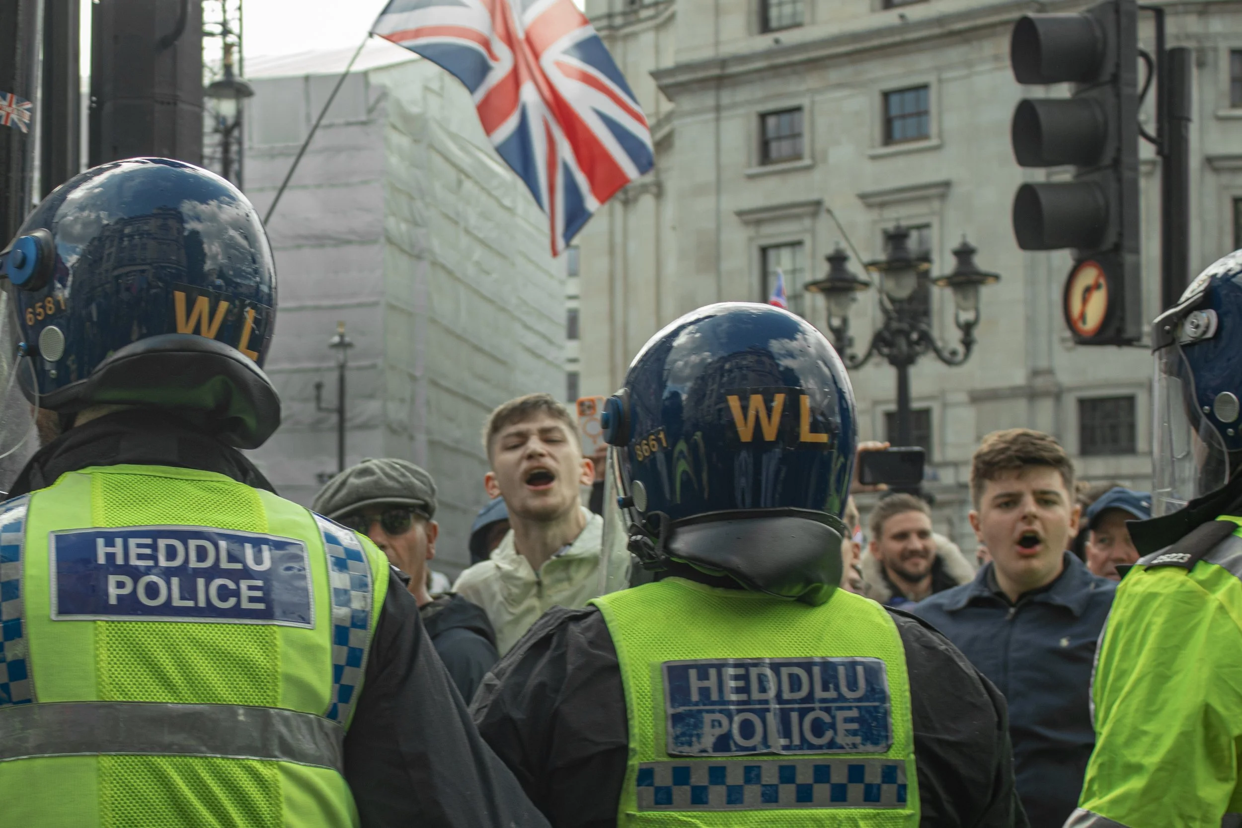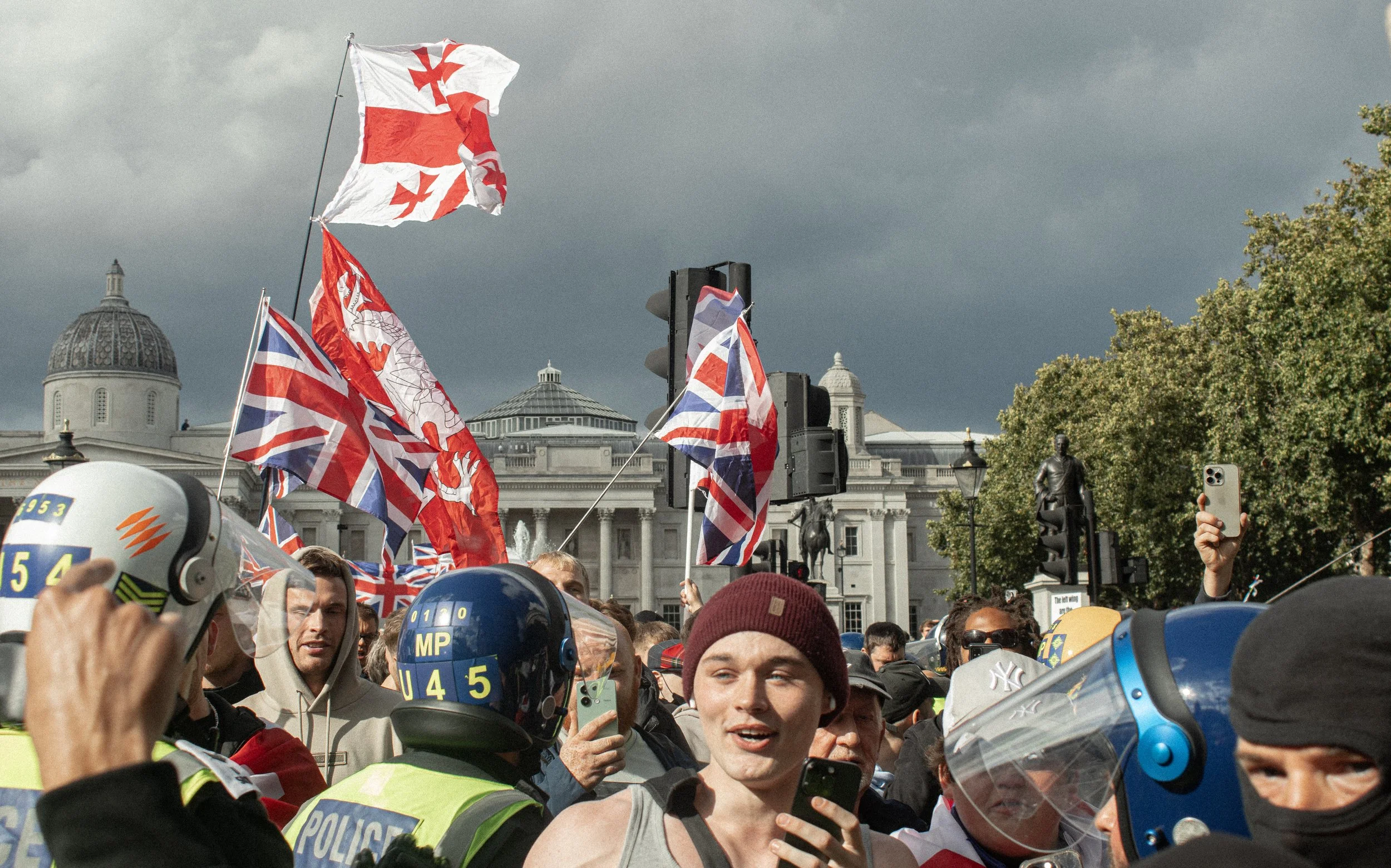 September 13th 2025 saw the largest fascist mobilisation in British history. These are photos taken from within the perspective of a strong but very outnumbered anti-fascist bloc which sought to oppose Tommy Robinson and his hundred thousand strong entourage. It was a fast paced, ever changing situation in central London on this occasion, with the peak being the cornering of the anti-fascist bloc by the far-right who proceeded to throw a strange selection of items including radiator keys, pound coins and then of course the classic Stella cans and bottles.