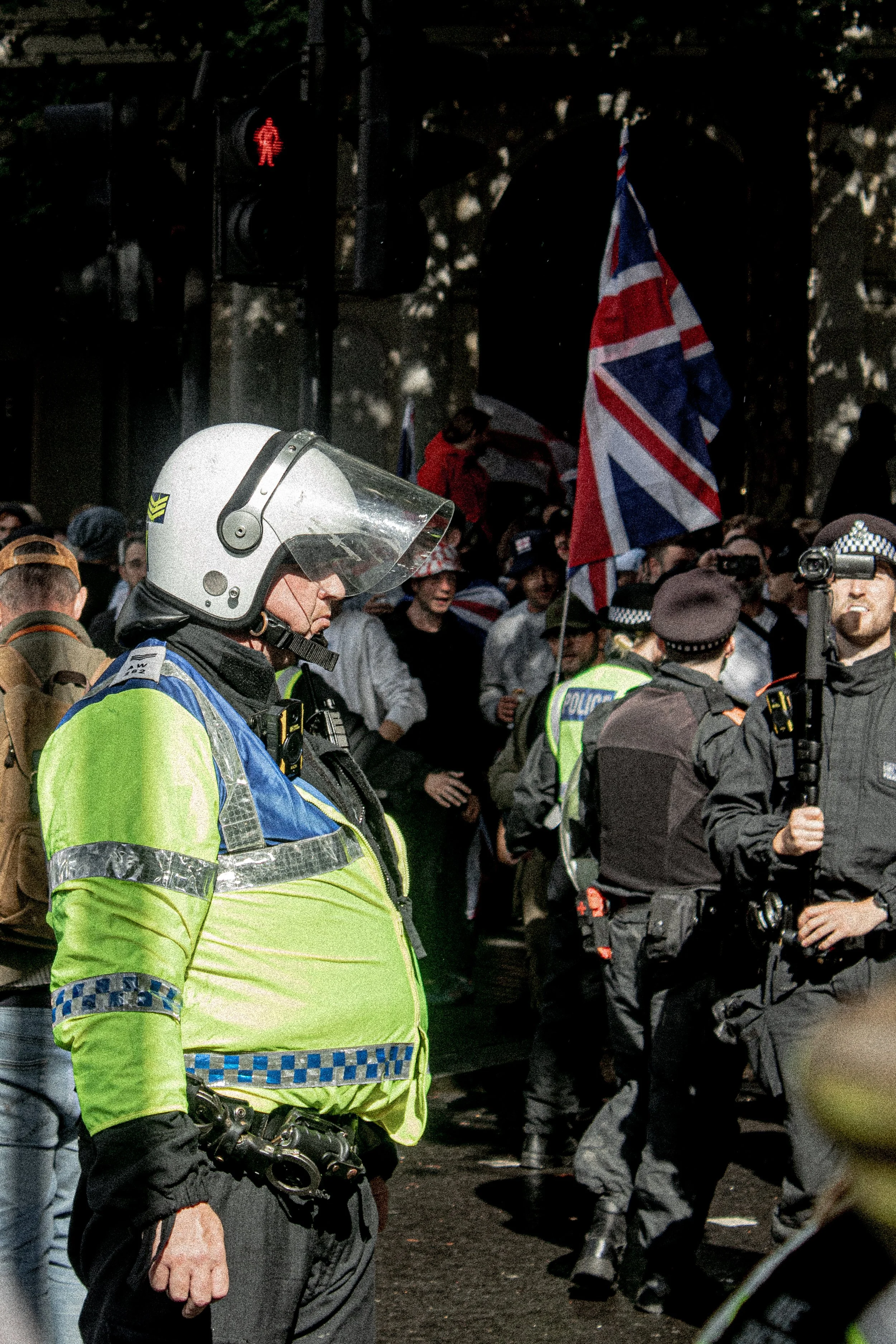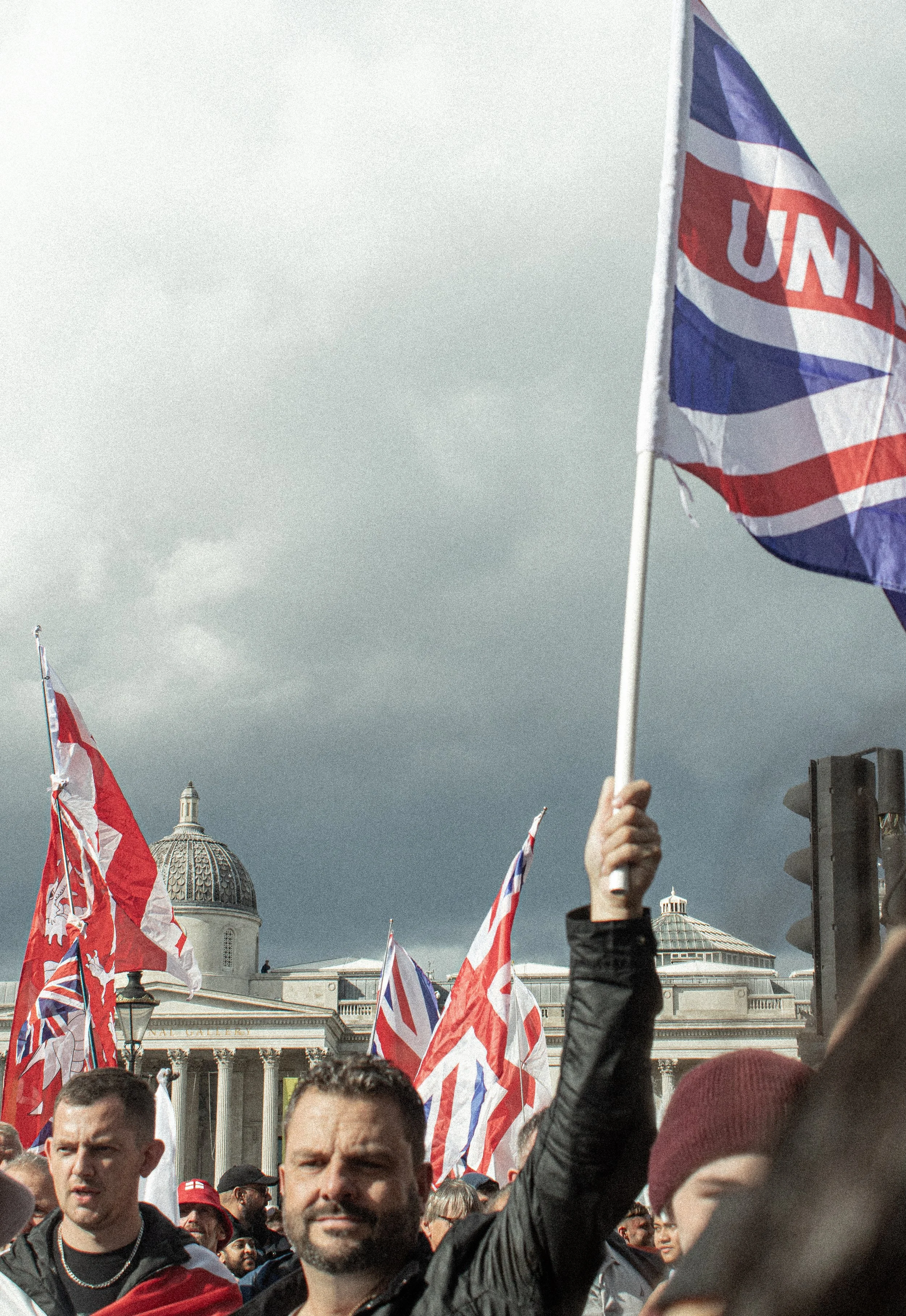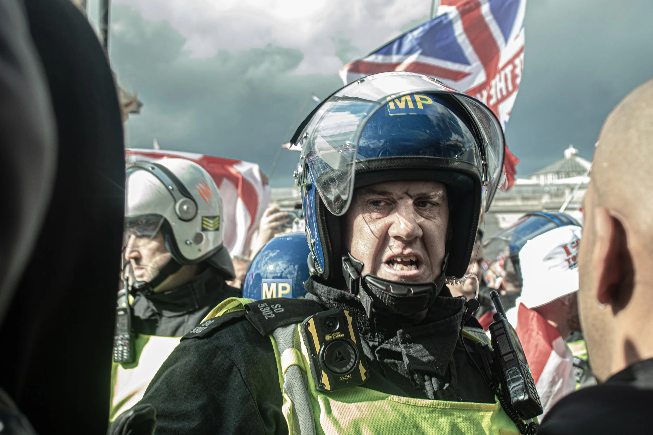 September 13th 2025 saw the largest fascist mobilisation in British history. These are photos taken from within the perspective of a strong but very outnumbered anti-fascist bloc which sought to oppose Tommy Robinson and his hundred thousand strong entourage. It was a fast paced, ever changing situation in central London on this occasion, with the peak being the cornering of the anti-fascist bloc by the far-right who proceeded to throw a strange selection of items including radiator keys, pound coins and then of course the classic Stella cans and bottles.